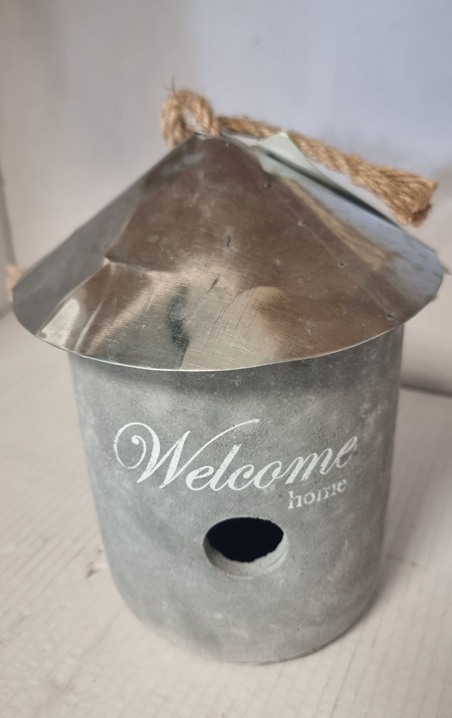 Akasztható madáretető, cement ház, lemez tető.