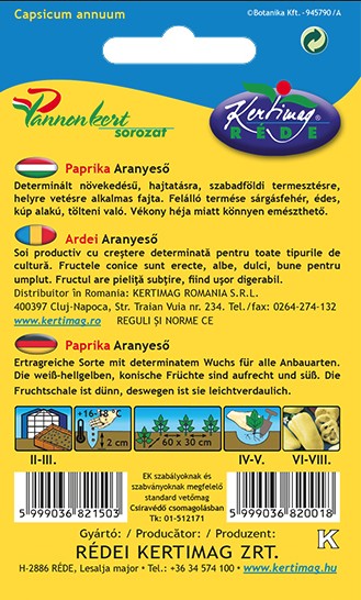 Vetési idő: március, palántázási idő: május, betakarítási idő: július-szeptember